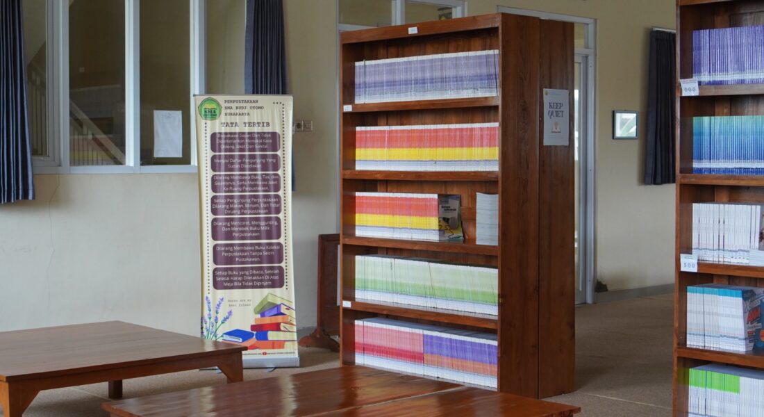 Perpustakaan SMA Budi Utomo Surakarta merupakan salah satu fasilitas unggulan sekolah yang dirancang untuk mendukung kegiatan belajar dan literasi siswa secara optimal. Dengan ruang yang luas, bersih, dan tertata rapi, perpustakaan ini memberikan suasana yang nyaman dan kondusif bagi para siswa maupun guru. Dilengkapi dengan fasilitas ruangan ber-AC, perpustakaan menghadirkan kenyamanan ekstra sehingga pengunjung dapat belajar dan membaca dalam suasana sejuk dan tenang. Selain itu, tersedia pula fasilitas komputer yang dapat dimanfaatkan untuk mencari referensi tambahan, mengakses informasi digital, serta menunjang kegiatan pembelajaran berbasis teknologi. Koleksi buku yang tersedia cukup lengkap, meliputi buku pelajaran sesuai kurikulum, buku referensi, hingga berbagai buku bacaan umum seperti novel, karya ilmiah, dan literatur pengembangan diri. Hal ini menjadikan perpustakaan sebagai pusat sumber belajar yang kaya akan informasi dan pengetahuan. Dengan fasilitas yang memadai, suasana yang nyaman, serta koleksi buku yang dimiliki, Perpustakaan SMA Budi Utomo Surakarta diharapkan mampu menumbuhkan minat baca, meningkatkan wawasan, serta mendukung terciptanya generasi yang cerdas, berprestasi, dan berkarakter.